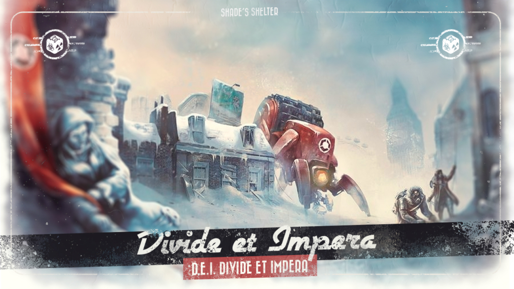 Divide et Impera pomimo początkowo wrażenia – jest dosyć złożoną grą Euro z mechaniką Worker Placement, gdzie 4 graczy będzie walczyć o kontrolę terenu oraz zdobywanie zasobów rozsianych po zlodowaconym Londynie. Celem gry jest oczywiście zdobycie jak największej liczby punktów, ale można to osiągnąć na kilka sposobów. Najważniejszą mechaniką jest wysłanie oddziałów po zasoby, które pozwolą aktywować różne umiejętności w grze, ale w grę wchodzić będzie kontrola posterunków, kontrola marketu i wykonywanie misji. Każda frakcja dysponuje nieco innymi jednostkami, umiejętnościami i możliwościami, które definiują ich styl gry. Dużą rolą w rozgrywce pełni rolę rynek, na którym można zakupić nowe umiejętności i ulepszyć sobie talię startowych kart akcji, które są całkiem inne w zależności od frakcji. Pomimo agresywnie wyglądających frakcji – nie ma w tej grze bezpośredniej walki, a raczej walka o wpływy oraz przepychanie się na planszy – coś na wzór tego co jest w Ocalałych.
